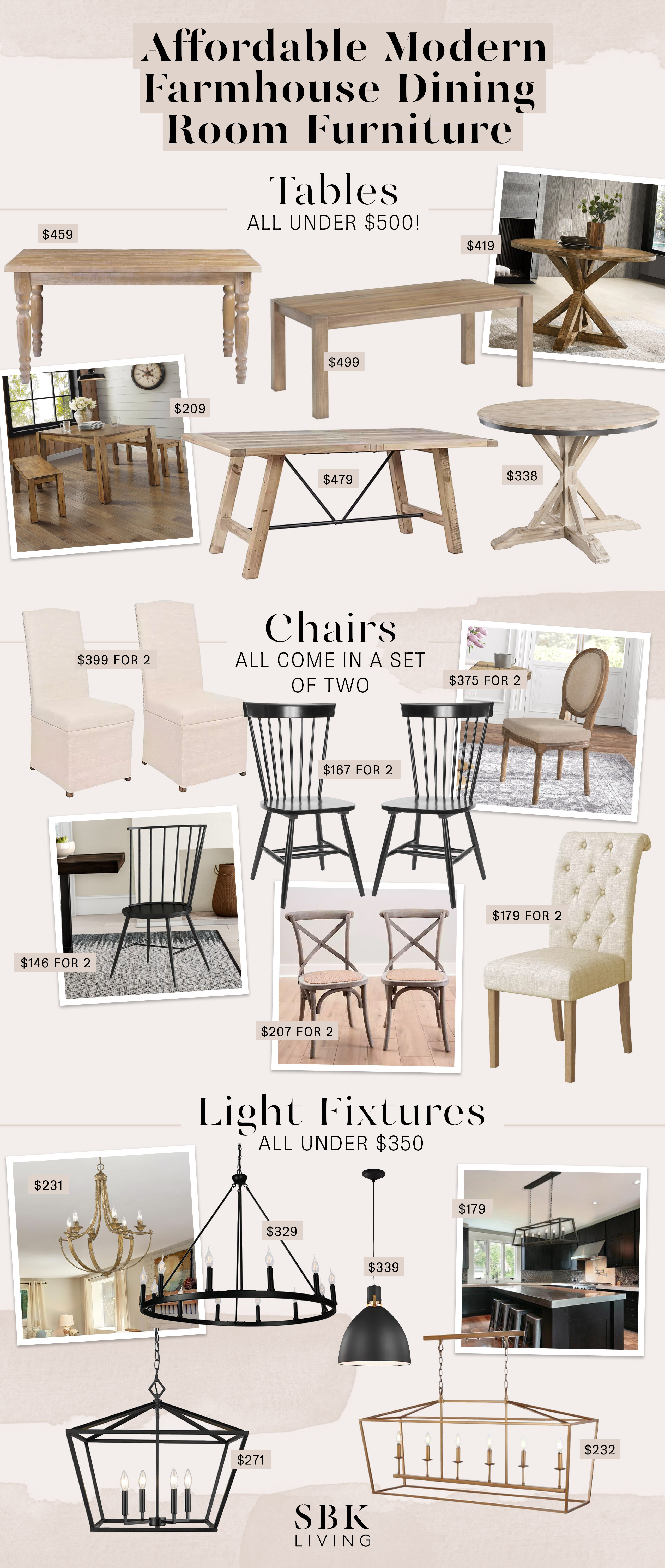 The above collage is linked. Click on a product you like and it will take you directly to it! Note all of the tables are under $500, every chair I selected comes in a set of two for the price listed and all light fixtures are under $350. SO many deals!